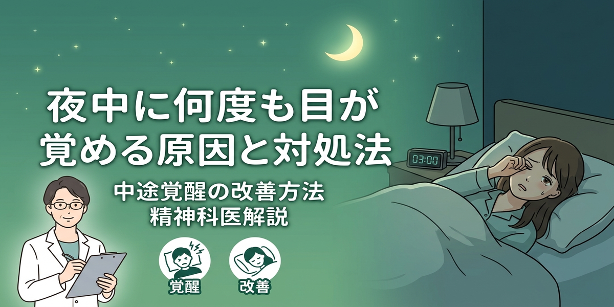 「夜中に何度も目が覚めてしまい、朝まで熟睡できない」「眠りが浅く、日中もぼんやりする」とお悩みではありませんか。中途覚醒は不眠症のなかでも非常に多く見られる症状で、ストレスや加齢、生活習慣、こころの不調などさまざまな要因が関係しているとされています。本記事では、夜中に何度も目が覚める原因から具体的な対処法、受診の目安までをわかりやすく解説します。