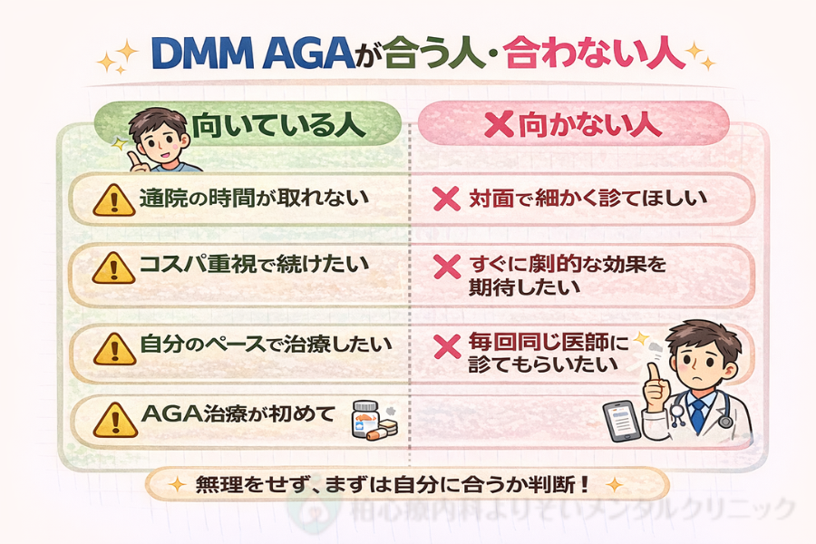 ここまで口コミ・副作用・料金プランについて見てきましたが、AGA治療は良い悪いではなく「自分に合うかどうか」で判断することが重要です。そこでこの章では、実際の利用傾向をもとに、DMMオンラインクリニックのAGA治療が向いている人・向いていない人をご紹介します。