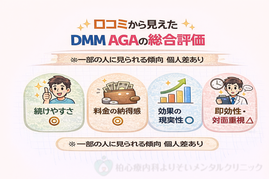口コミを総合すると、DMMオンラインクリニックのAGA治療は短期間での変化を求める人よりも、生活に負担をかけずに治療を続けたい人から支持されていることが分かりました。