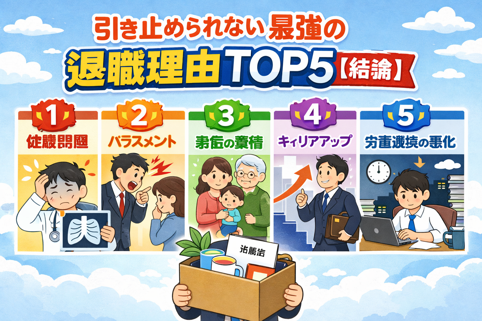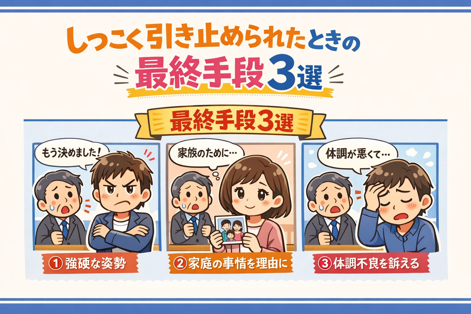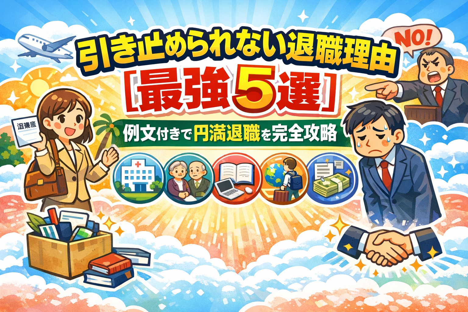 結論から言えば、会社や上司が「それなら仕方ない」と納得せざるを得ない退職理由を準備すれば、引き止めをかわして円満退職できます。この記事では、引き止められない最強の退職理由TOP5・状況別の例文・NGな退職理由・嘘のリスク・しつこく引き止められたときの最終手段まで徹底解説します。