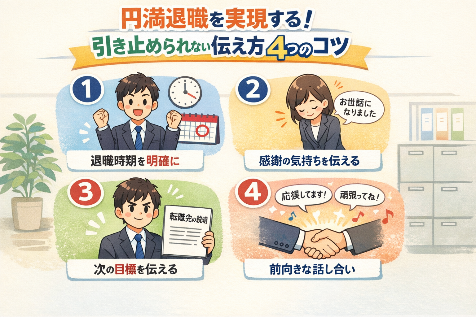 どんなに完璧な退職理由を用意しても、伝え方ひとつで結果は大きく変わります。円満退職を成功させる4つの重要なコツを紹介します。