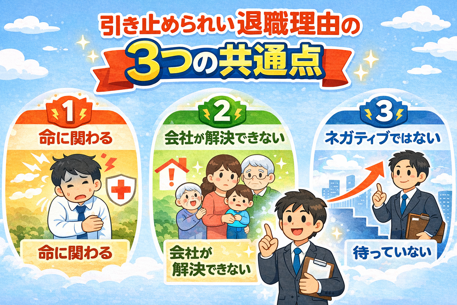 最も重要な共通点は、その理由が会社側の努力では解決できない個人的な問題であることです。「給与が低い」なら「昇給させる」という代替案が出せますが、「親の介護」に対して会社ができることはほとんどありません。健康問題・家族の事情・家業の承継など、個人のプライベートな領域は会社にとって「アンタッチャブル(不可侵)」な領域なのです。