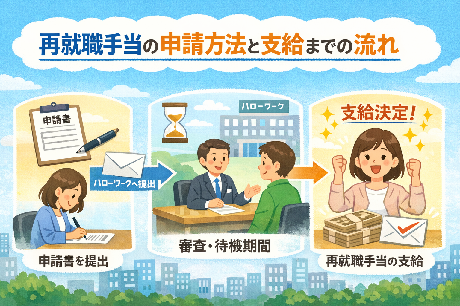 ハローワークから「再就職手当支給申請書」が渡されます。入社後に再就職先に証明欄を記入してもらい、就職日の翌日から1か月以内にハローワークへ提出してください(郵送も可)。