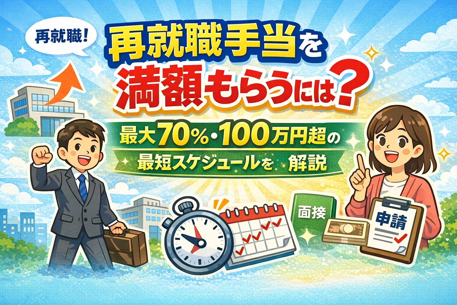 「再就職手当 100万」と検索する方が多いのはまさにこのケースです。会社都合退職で所定給付日数が長い方は、早期再就職で100万円超を受け取れる可能性があります。
