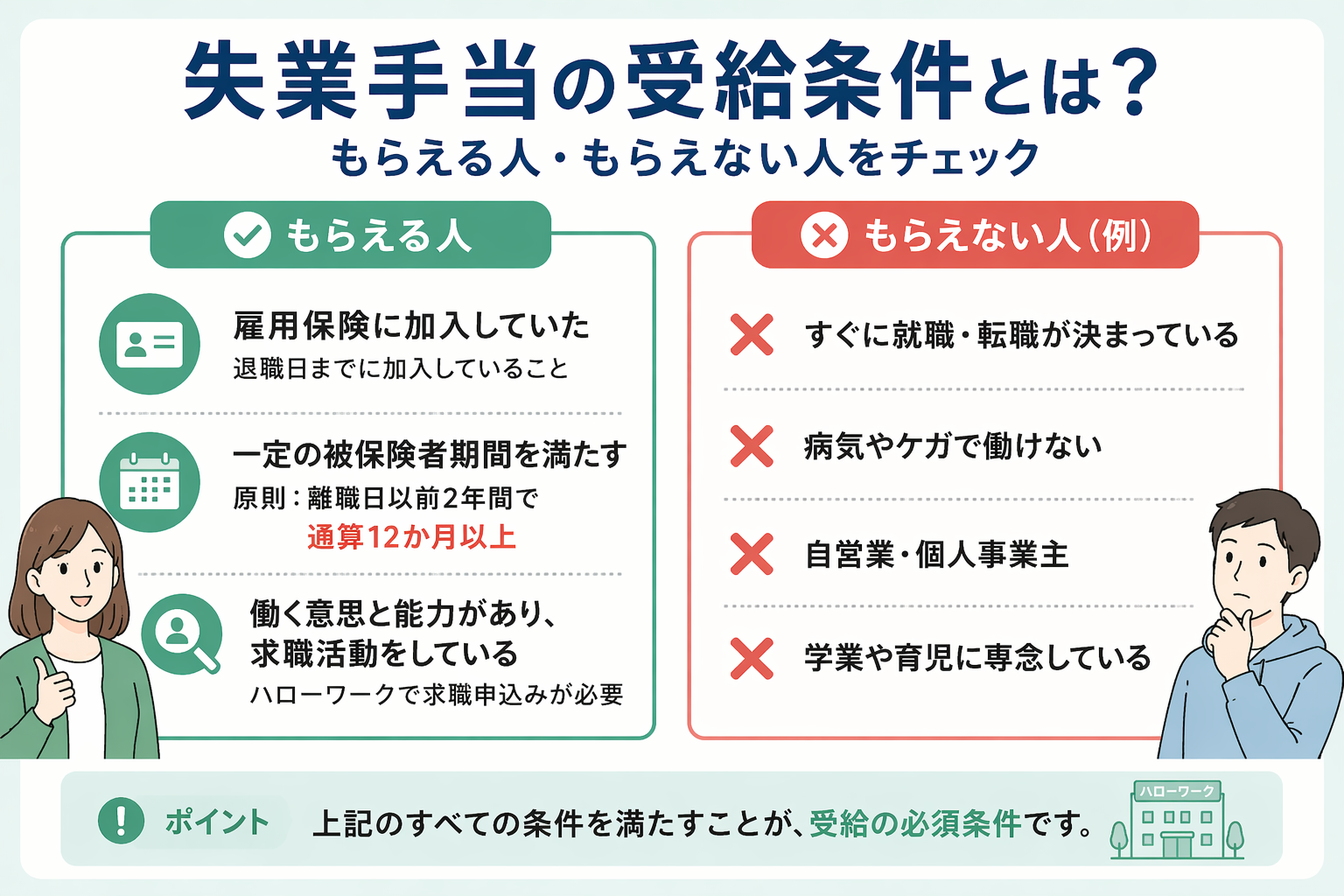 • 受給条件:雇用保険への加入・被保険者期間・求職意思の3つが必要