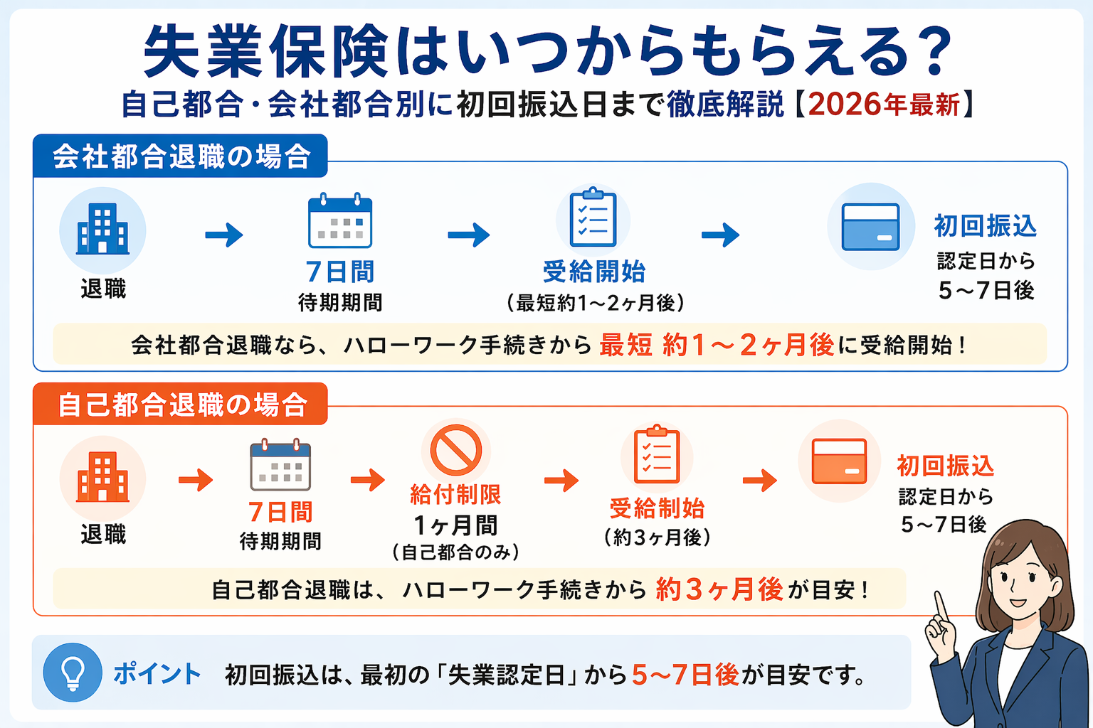 • 失業保険がいつからもらえるか結論:会社都合なら最短約1〜2ヶ月後、自己都合なら約3ヶ月後(ハローワーク手続き後)