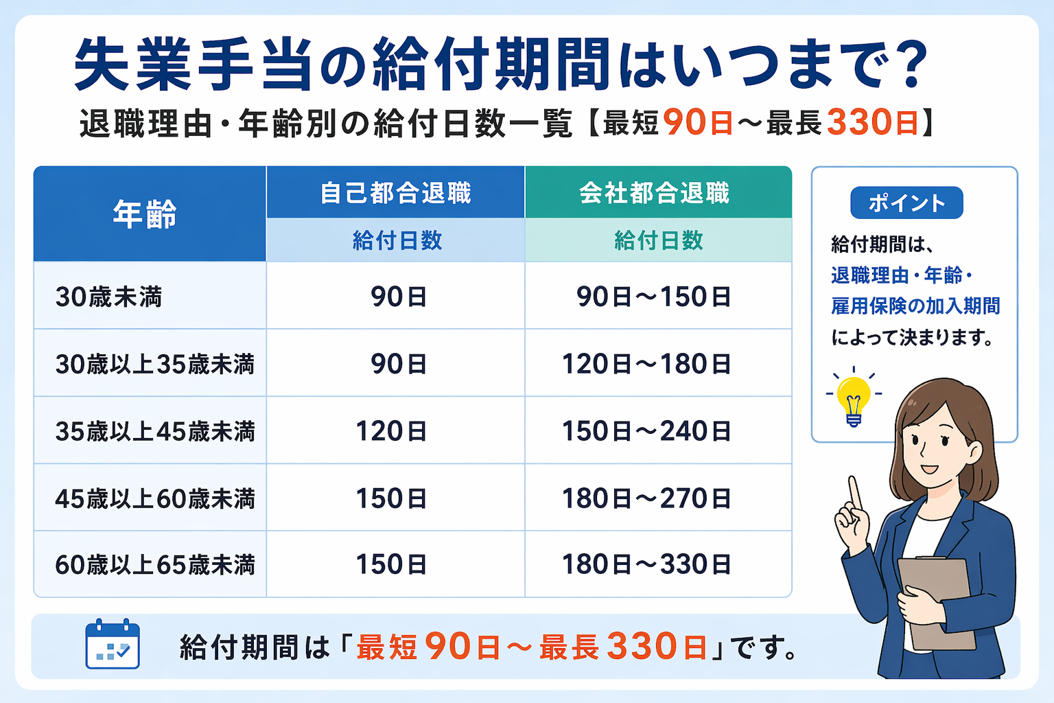 • 受給期間は退職理由・年齢・勤続年数によって最短90日〜最長330日