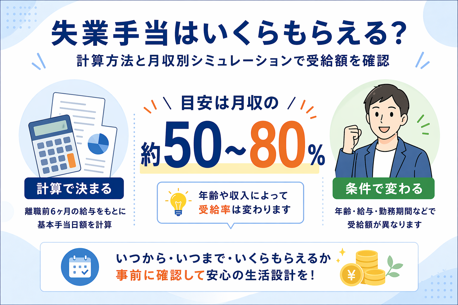 • 受給額は離職前6ヶ月の賃金をもとに計算、給付率は年齢・収入により50〜80%