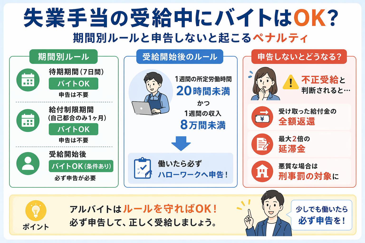 • 受給中のアルバイトは条件付きでOKだが、必ずハローワークへ申告が必要