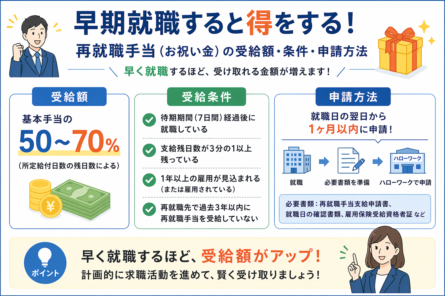 • 早期再就職なら再就職手当(お祝い金)も活用しよう