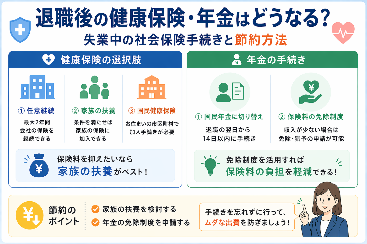 退職後の健康保険・年金はどうなる?失業中の社会保険手続きと節約方法