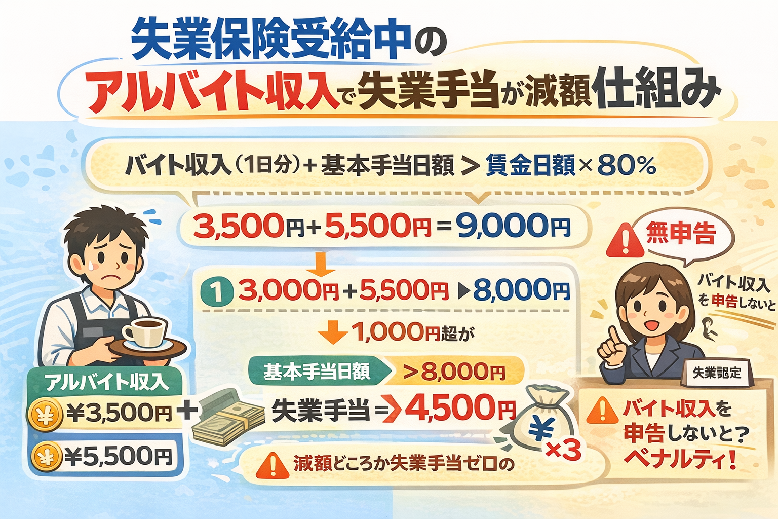 バイト収入(1日分)+ 基本手当日額 > 賃金日額 × 80%= 超えた分だけ基本手当が減額される