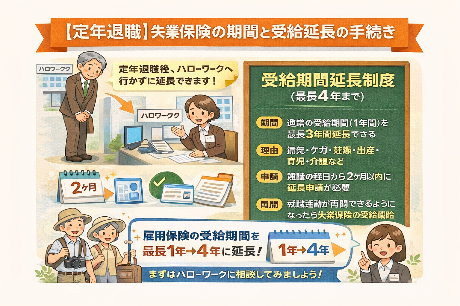 定年退職後に「しばらくゆっくりしたい」という場合、すぐにハローワークへ行かずに受給期間の延長手続きを行うことができます。