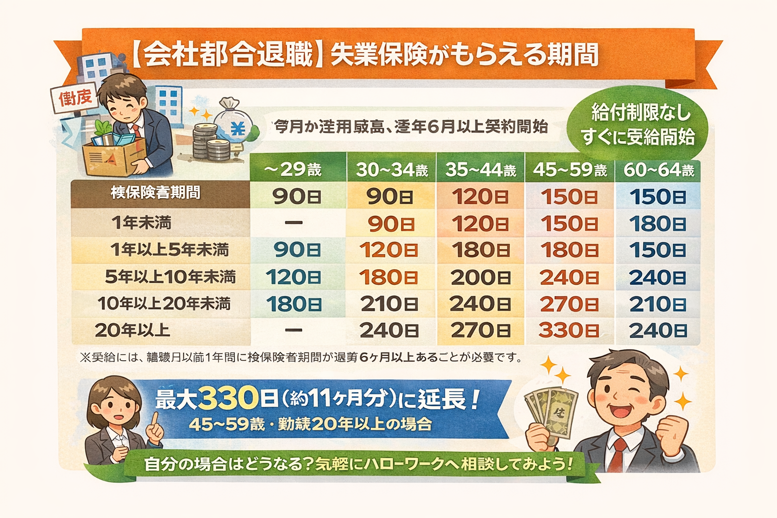倒産・解雇など会社側の事情による離職(特定受給資格者)や、雇い止めにあった方(特定理由離職者)は、自己都合よりも大幅に長い給付日数が設定されています。