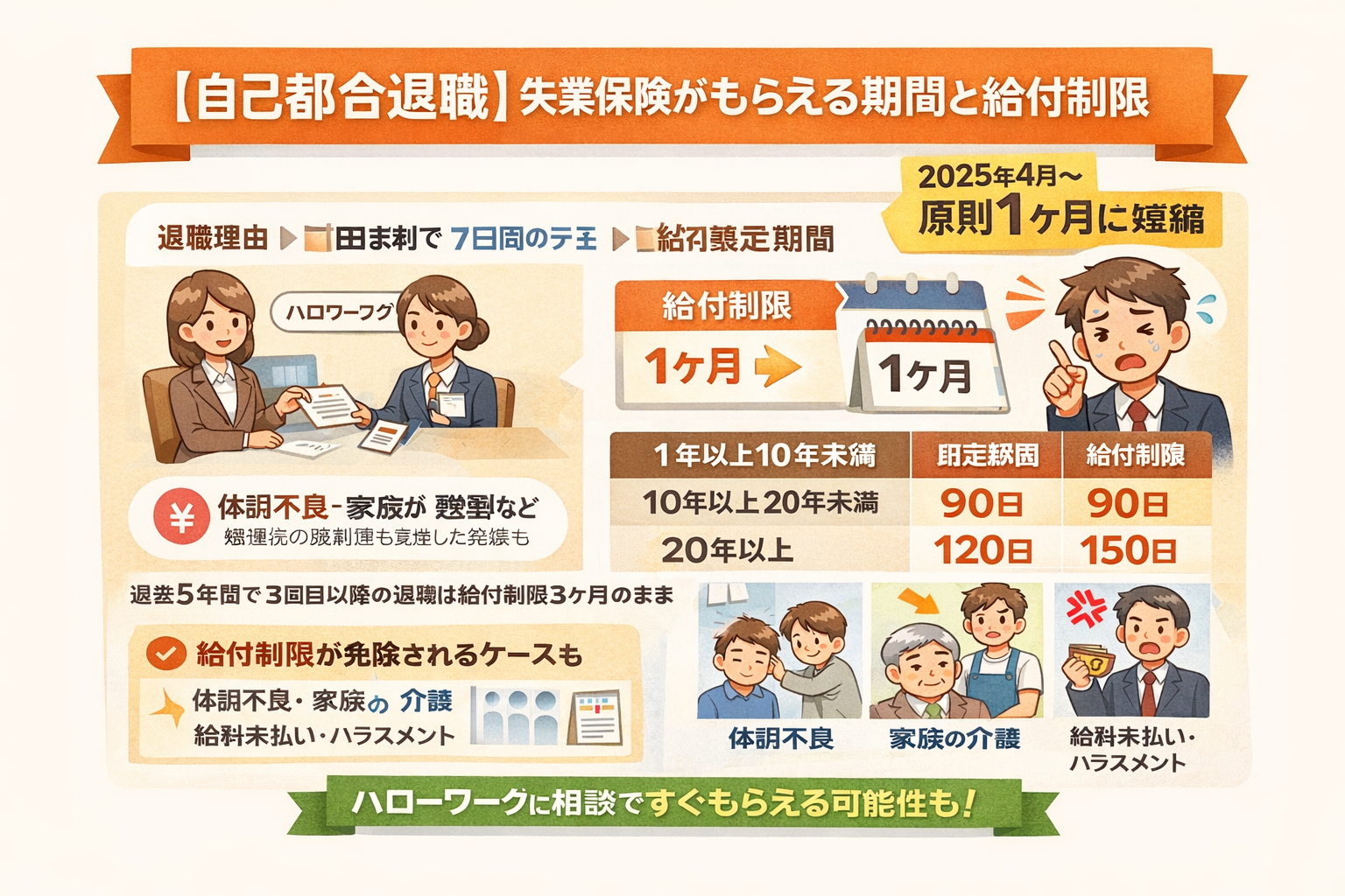 - 2025年4月から給付制限が2ヶ月→1ヶ月に短縮(教育訓練受講で撤廃も可能)