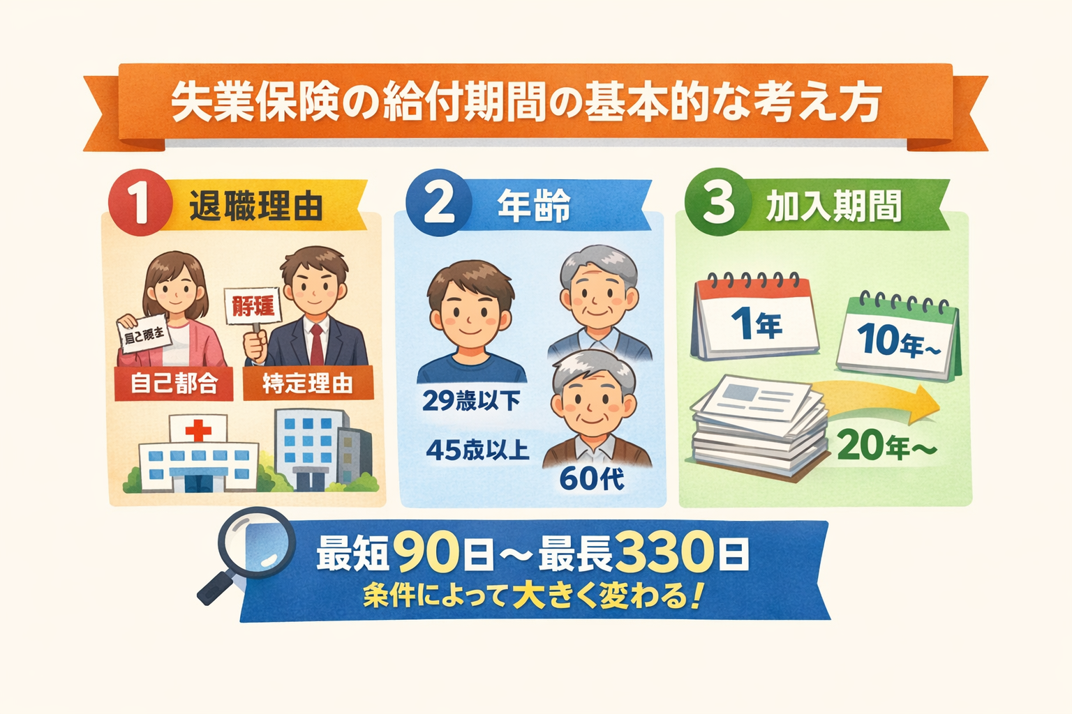 失業保険(雇用保険の基本手当)を何日間受け取れるかを示す日数を「所定給付日数」といいます。この日数は一律ではなく、次の3つの条件によって決まります。