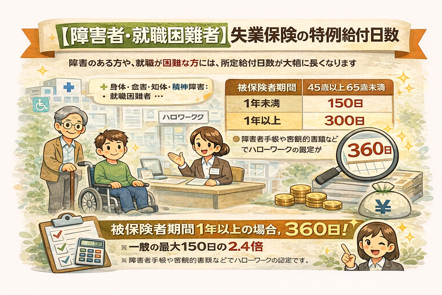 身体障害・知的障害・精神障害などをお持ちの方や、社会的な事情で就職が困難な方(就職困難者)には、一般の所定給付日数よりも大幅に長い特例が設けられています。