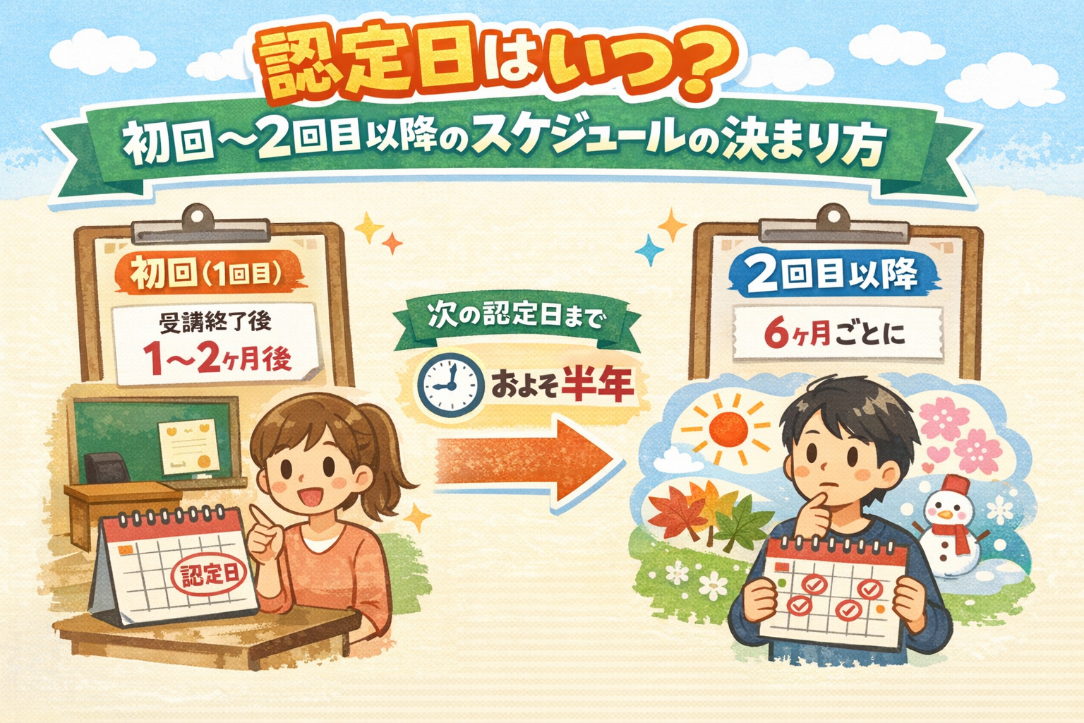 - 初回(1回目)認定日:説明会から約1〜2週間後。受給資格決定日から数えると約4週間後が目安です。