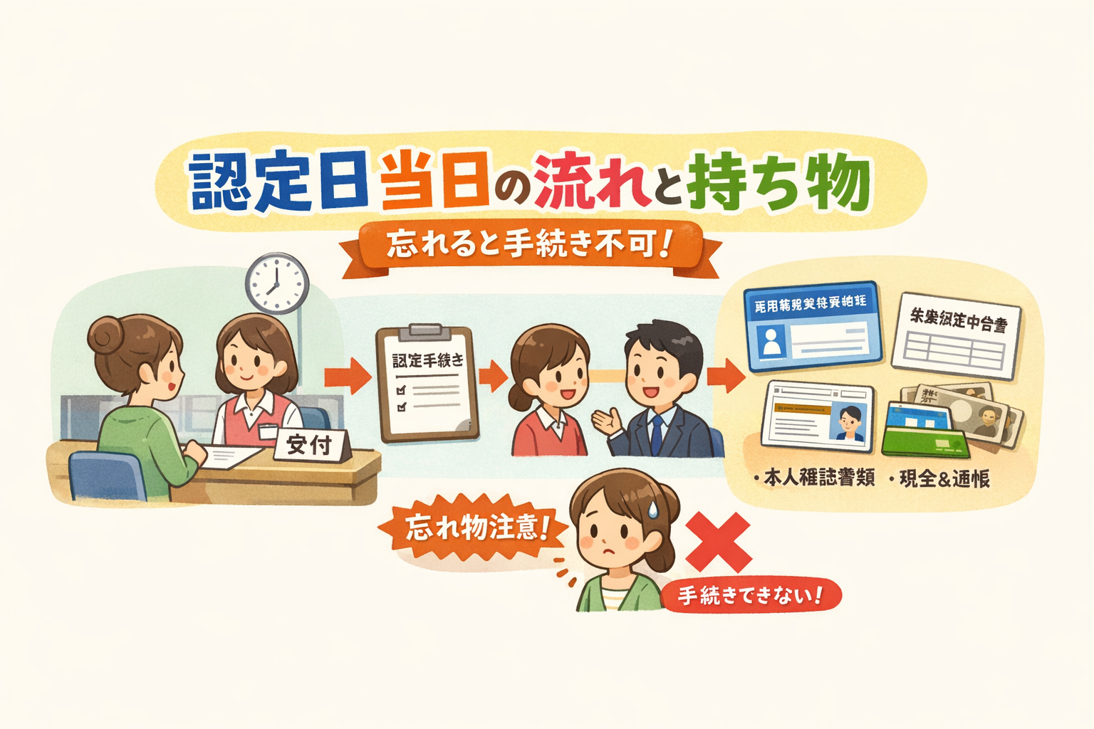 認定日当日の手続きは、通常15〜30分程度で完了します。事前に流れと持ち物を確認しておきましょう。