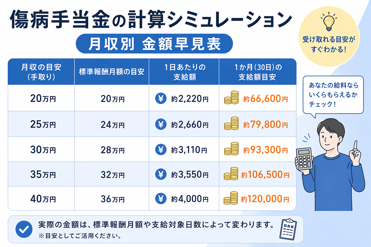 傷病手当金の計算シミュレーション|月収別 金額早見表