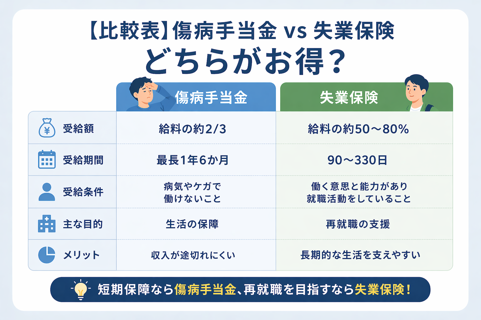【比較表】傷病手当金 vs 失業保険——どちらがお得?
