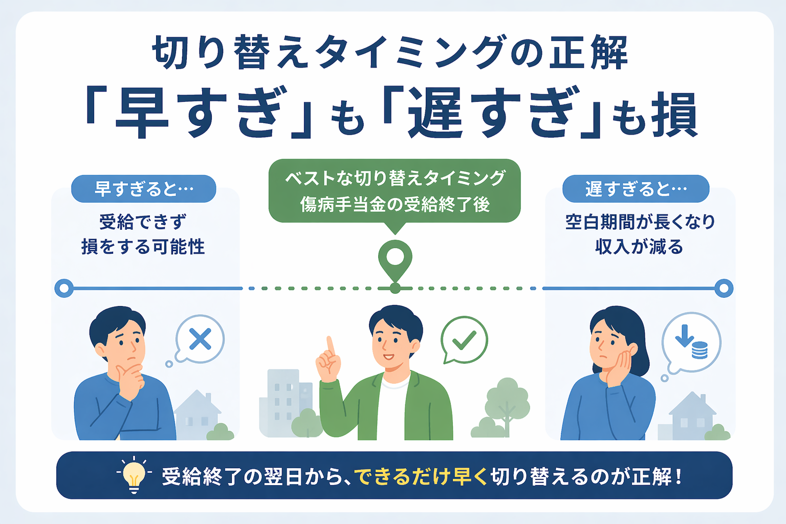 - 退職後に健康保険の傷病手当金への再申請はハードルが非常に高いため、切り替えのタイミングは慎重に