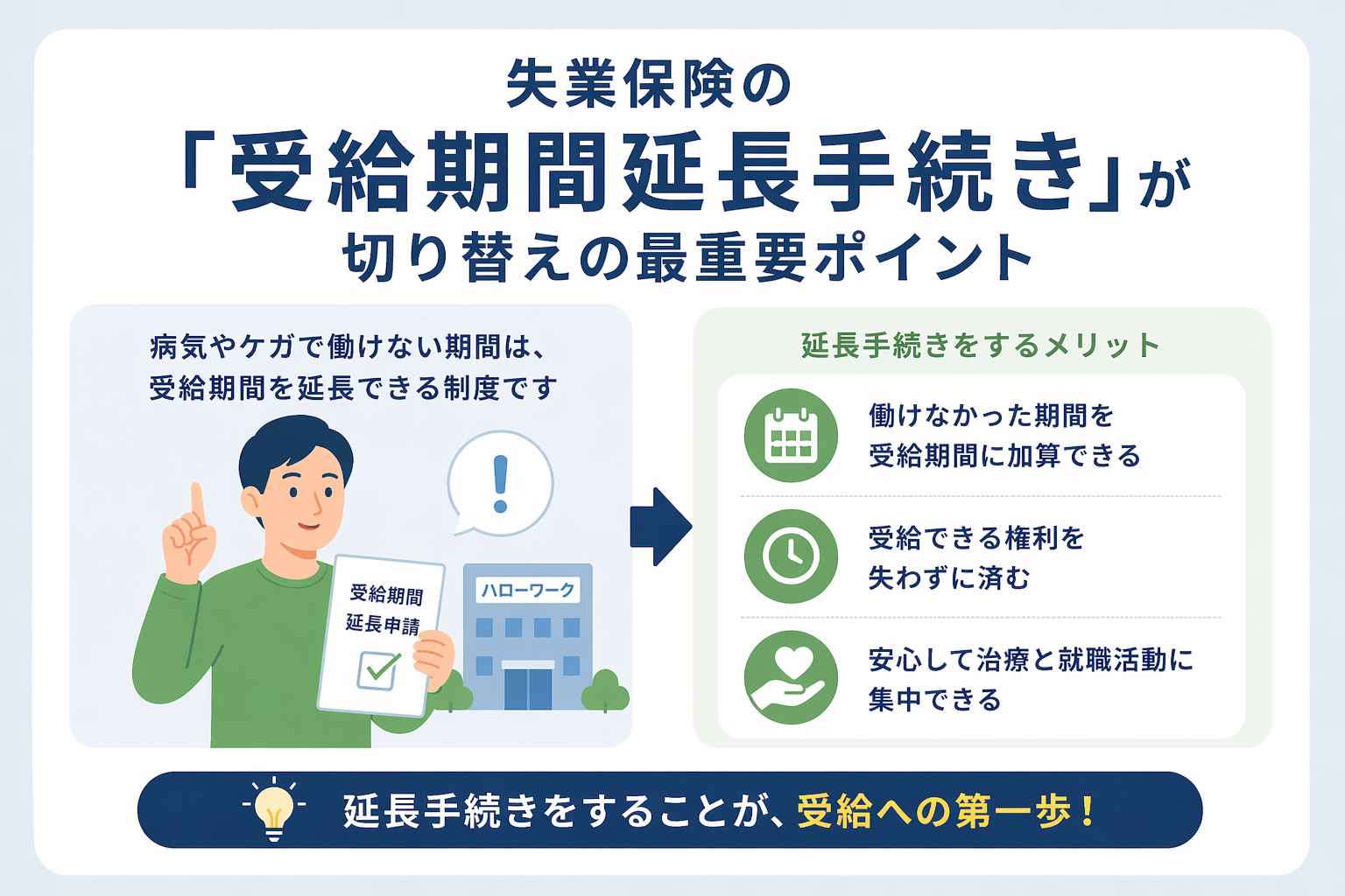 ⚠️ 延長しないとどうなる?傷病手当金(最長1年6ヶ月)を受け取り終わった後、ハローワークへ行ったら「受給期限の1年はとっくに過ぎています」と言われる可能性があります。役所同士が自動で連携してくれることはありません。自分で必ず手続きを。