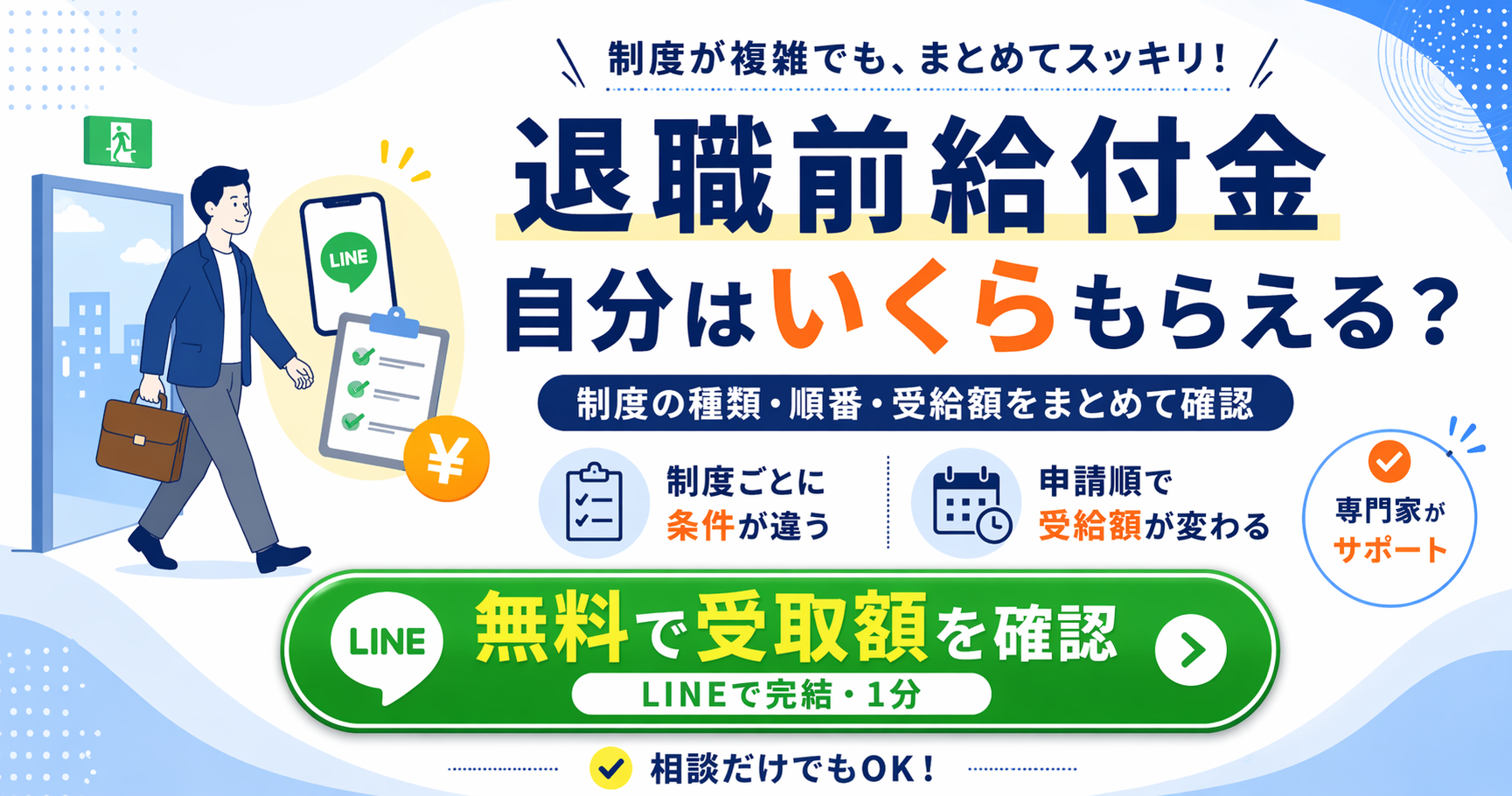 退職前給付金は、状況・退職理由によって関係する制度・申請順・受け取れる金額が人それぞれ異なります。「まだ大丈夫」と後回しにしているうちに申請期限を超えてしまったというケースが後を絶ちません。
