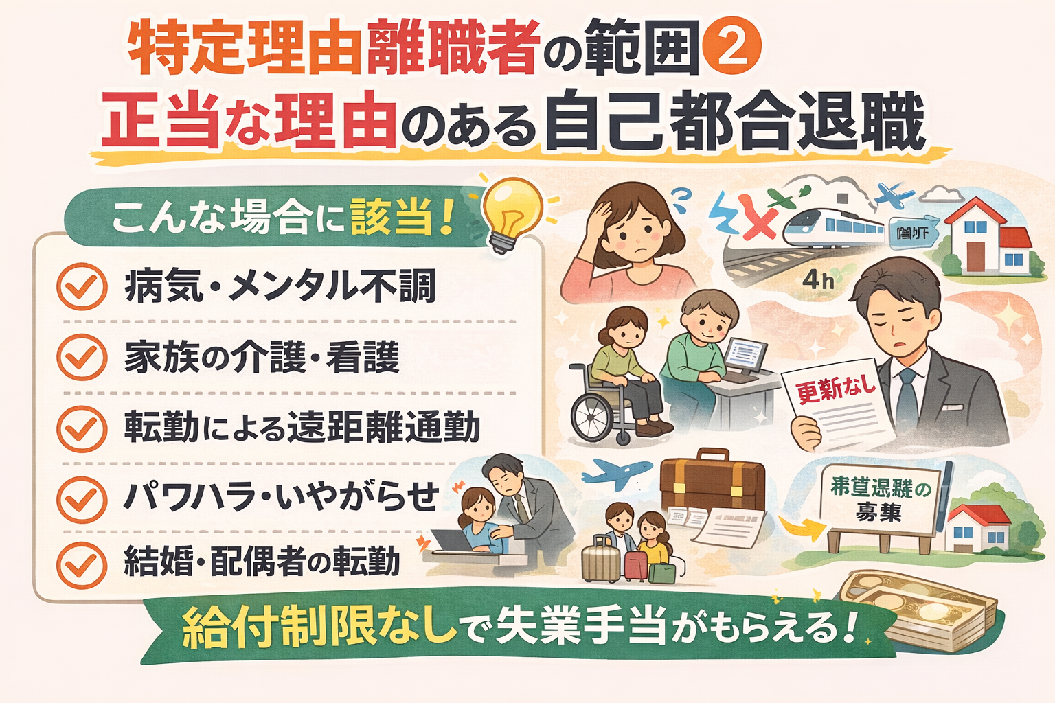 病気・介護・雇い止め・通勤困難など、該当する理由は思った以上に幅広いです。しかし「自分が対象か分からない」「必要書類や診断書がいるのか不安」「ハローワークでどう判定されるのか」と悩む方も多いのではないでしょうか。