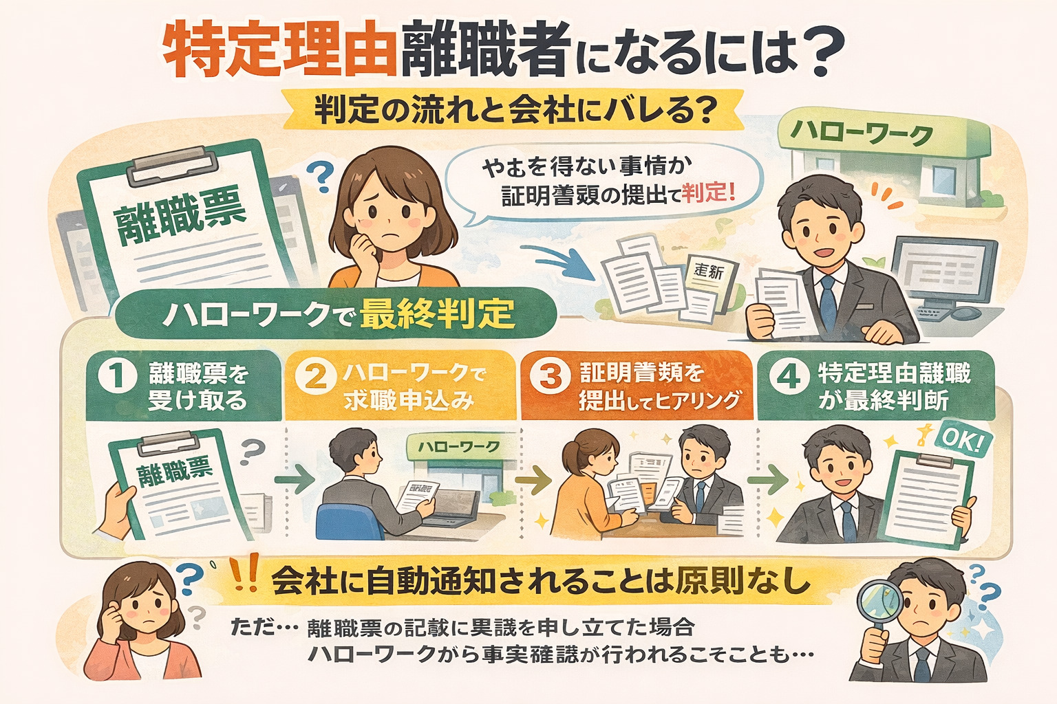 特定理由離職者に認定されたこと自体が会社に通知されることは、原則ありません。ただし、会社側もハローワークから「離職理由の確認」の連絡を受ける場合があります。