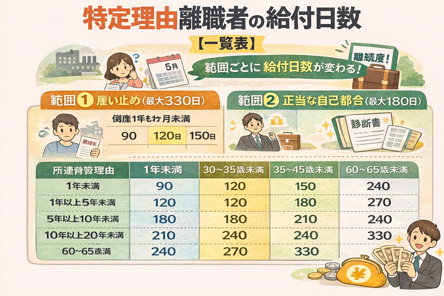 - 給付日数は雇い止めで最大330日、正当な自己都合で最大180日