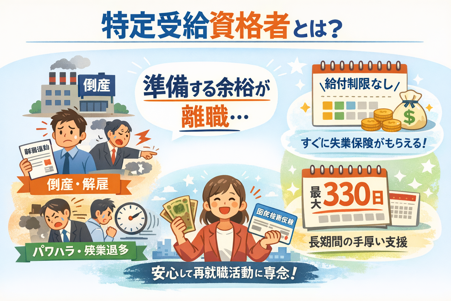• 特定受給資格者とは:倒産・解雇・ハラスメント・長時間労働など「会社都合」で離職した人。