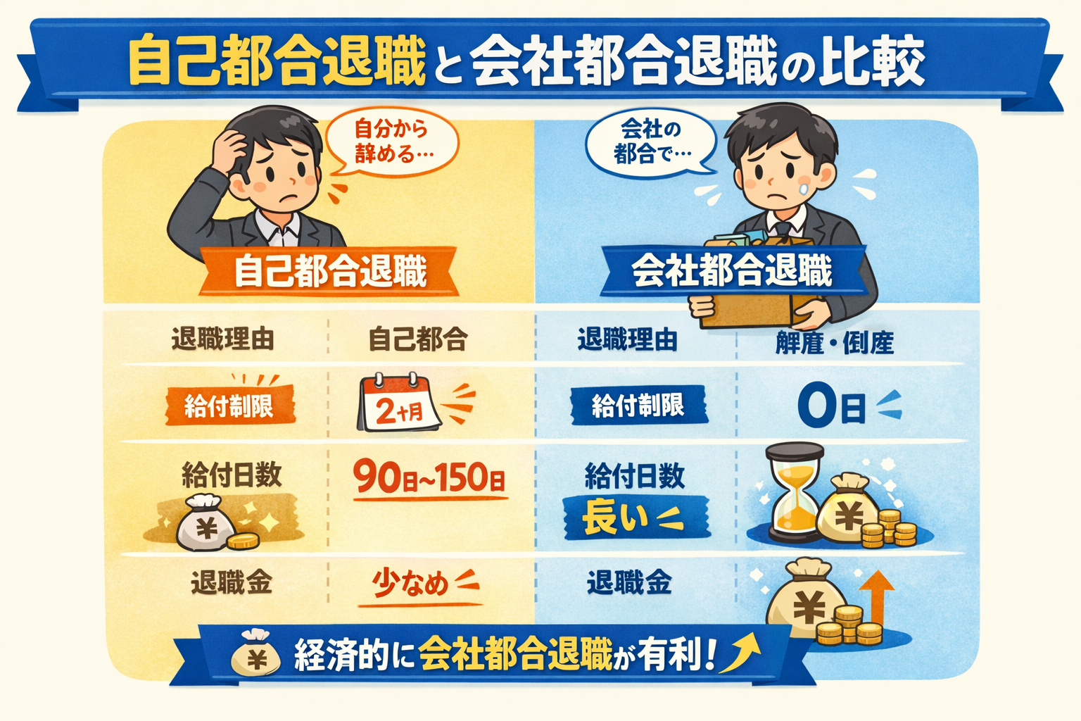 - ✅ 失業保険:会社都合の方が早く、長く、多くもらえる